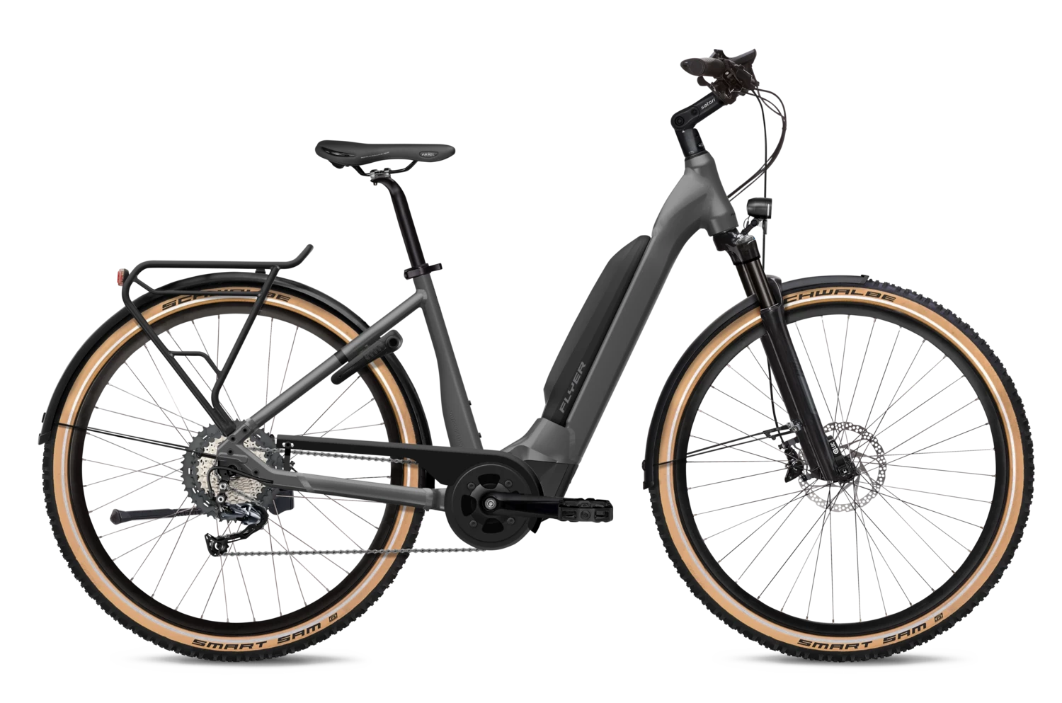 Découvrez la nouvelle gamme FLYER 2022. VTC Electrique FLYER Upstreet5 3.12 630Wh, cadre Col de Cygne. Moteur PANASONIC GX Power 75Nm, batterie FLYER SIB 630Wh.
